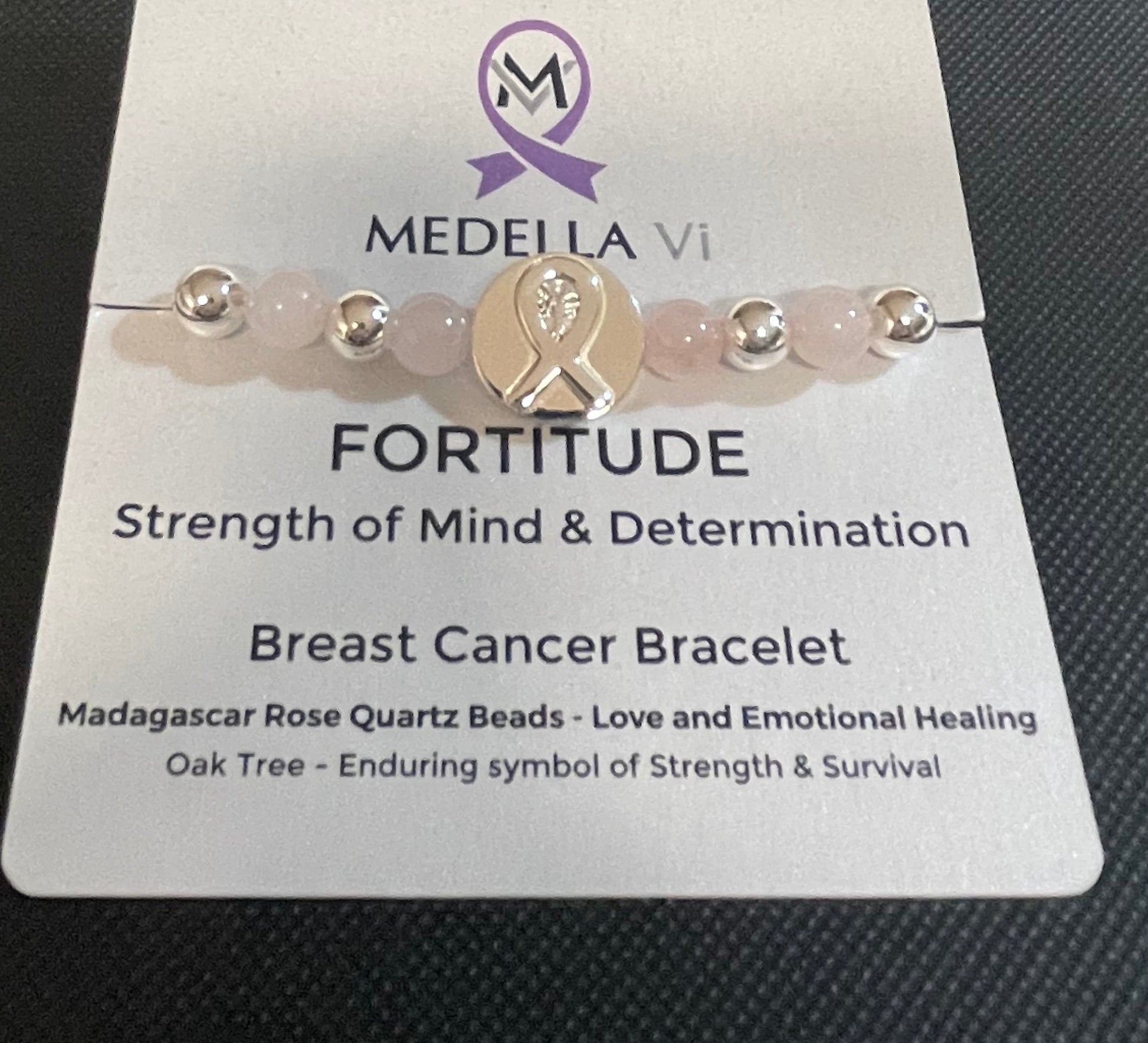 Our top-quality Madagascar Rose Quartz beads, known to bring Love and Emotional Healing with our Medella Vi signature medallion, a silver-plated Oak Tree wrapped in the awareness ribbon represents Enduring Strength and Survival.